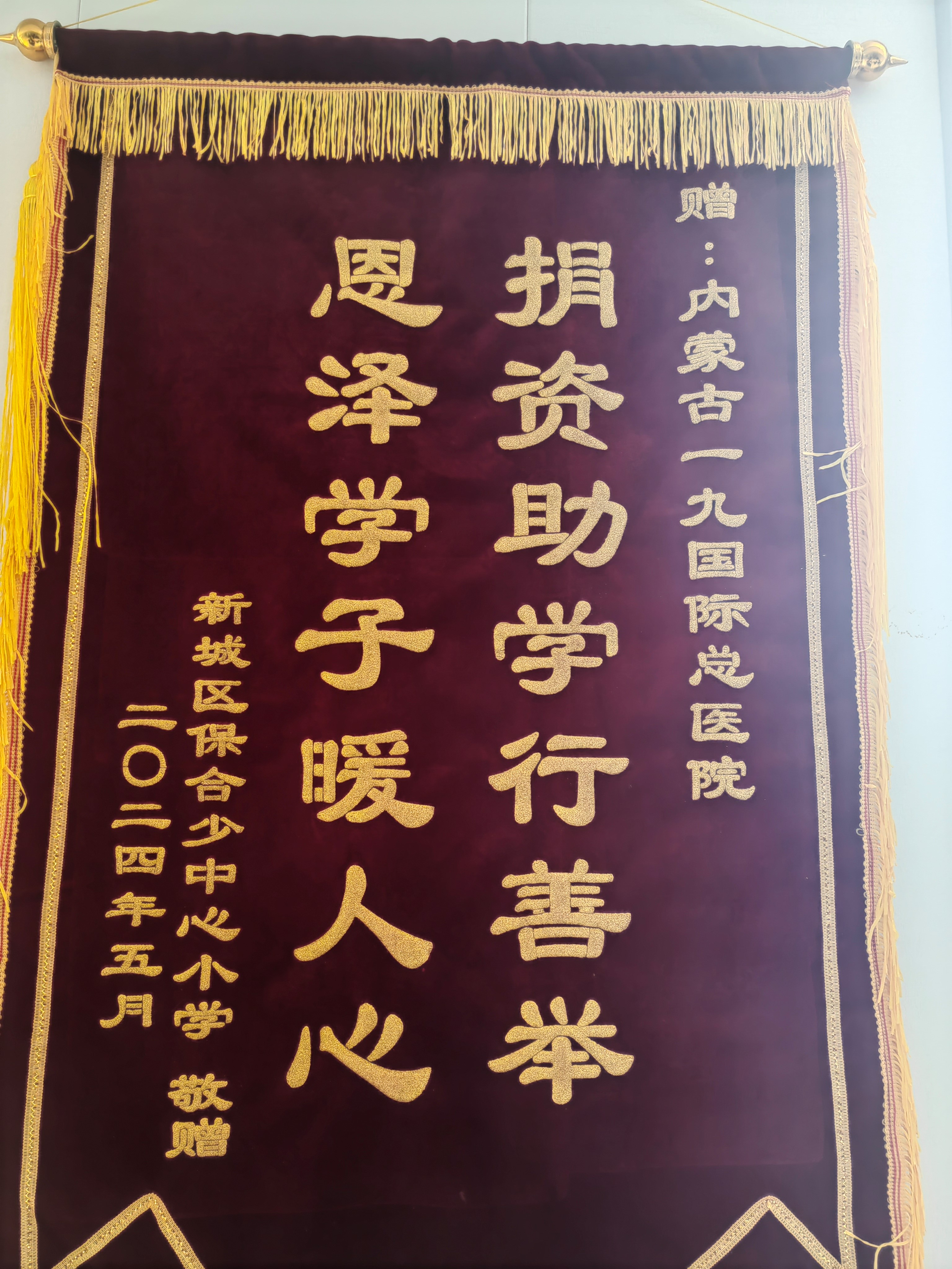 活动最后,新城区保合少中心小学为爱心企业内蒙古一九国际总医院赠送了锦旗。